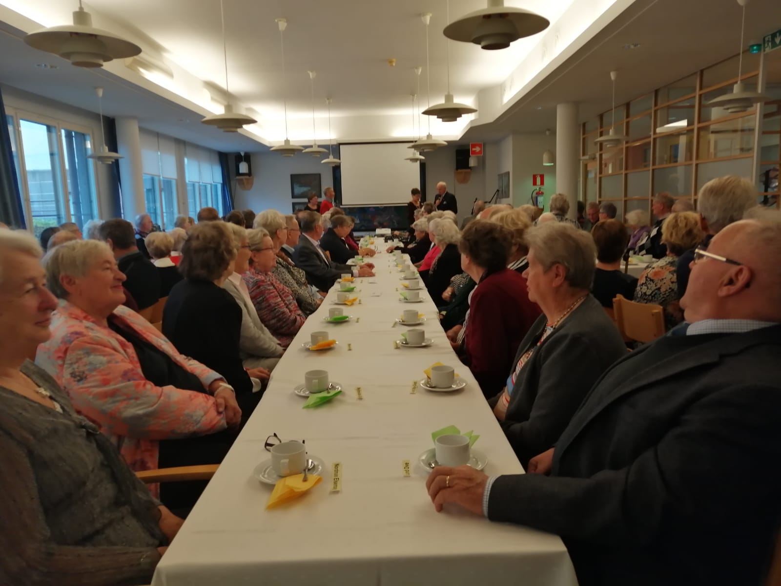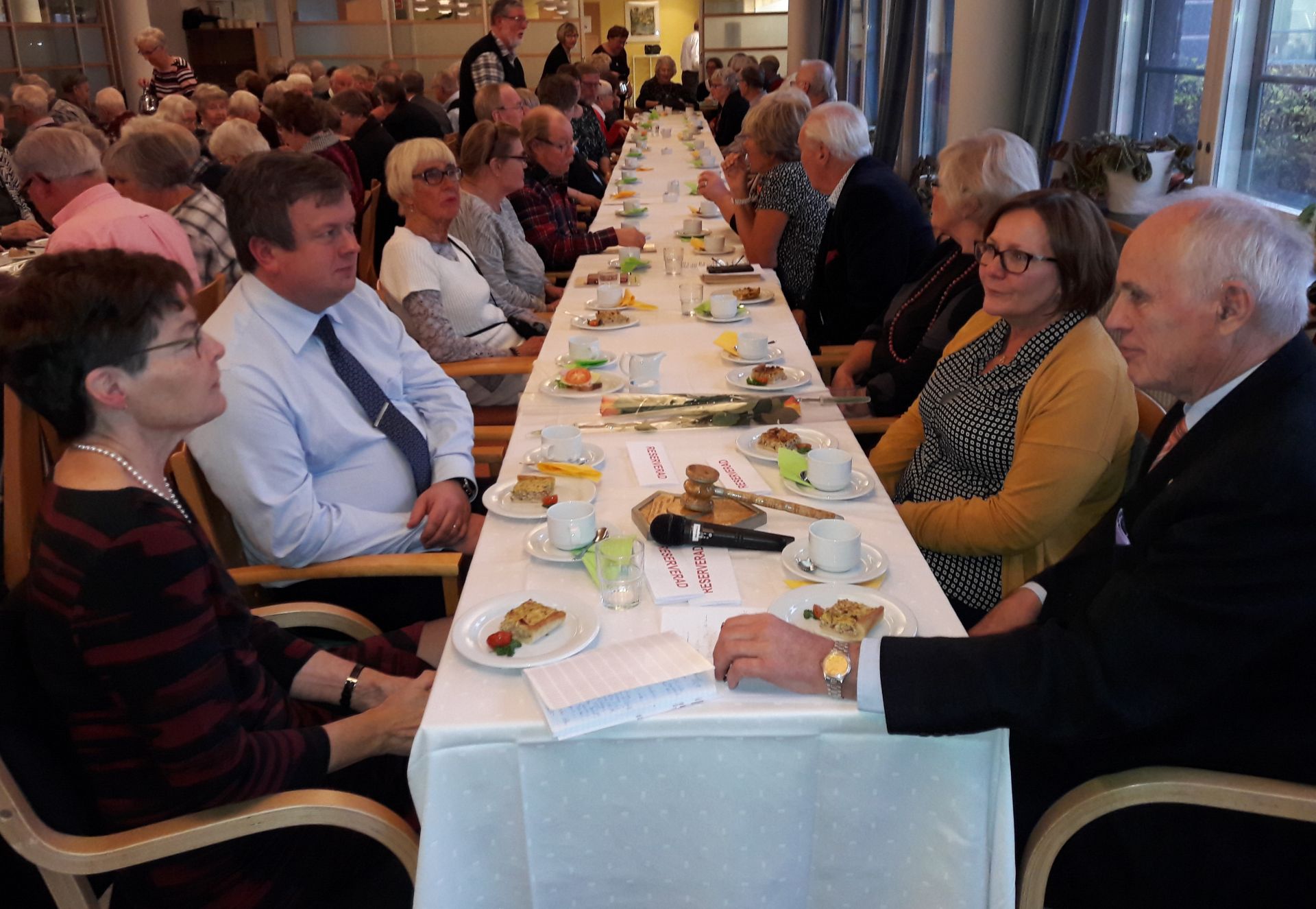 Håkan Karlsson presenterade Mia Aitokari som förtroendemannaboss i Agricola svenska församling. Mia berättade hur församlingsstrukturen i Lovisanejden förändrats från Pernå församling på 1200-talet till Agricola svenska församling 2019. Mötesdeltagarna lyssnade med stort intresse på hur kyrkobyggnaderna byggdes utvändigt på ett år under medeltiden, (insidan kunde ta flera hundra år att bli färdig) Mia berättade om silvergruvan i Forsby, om präster och andra stormän i församlingen, om hur Arvid Tönnesson Wildeman antagligen gett namn åt staden Willmanstrand och att saltad vimpa var Pernå främsta exportartikeln under medeltiden.