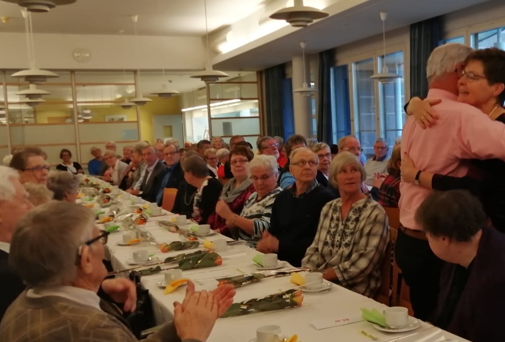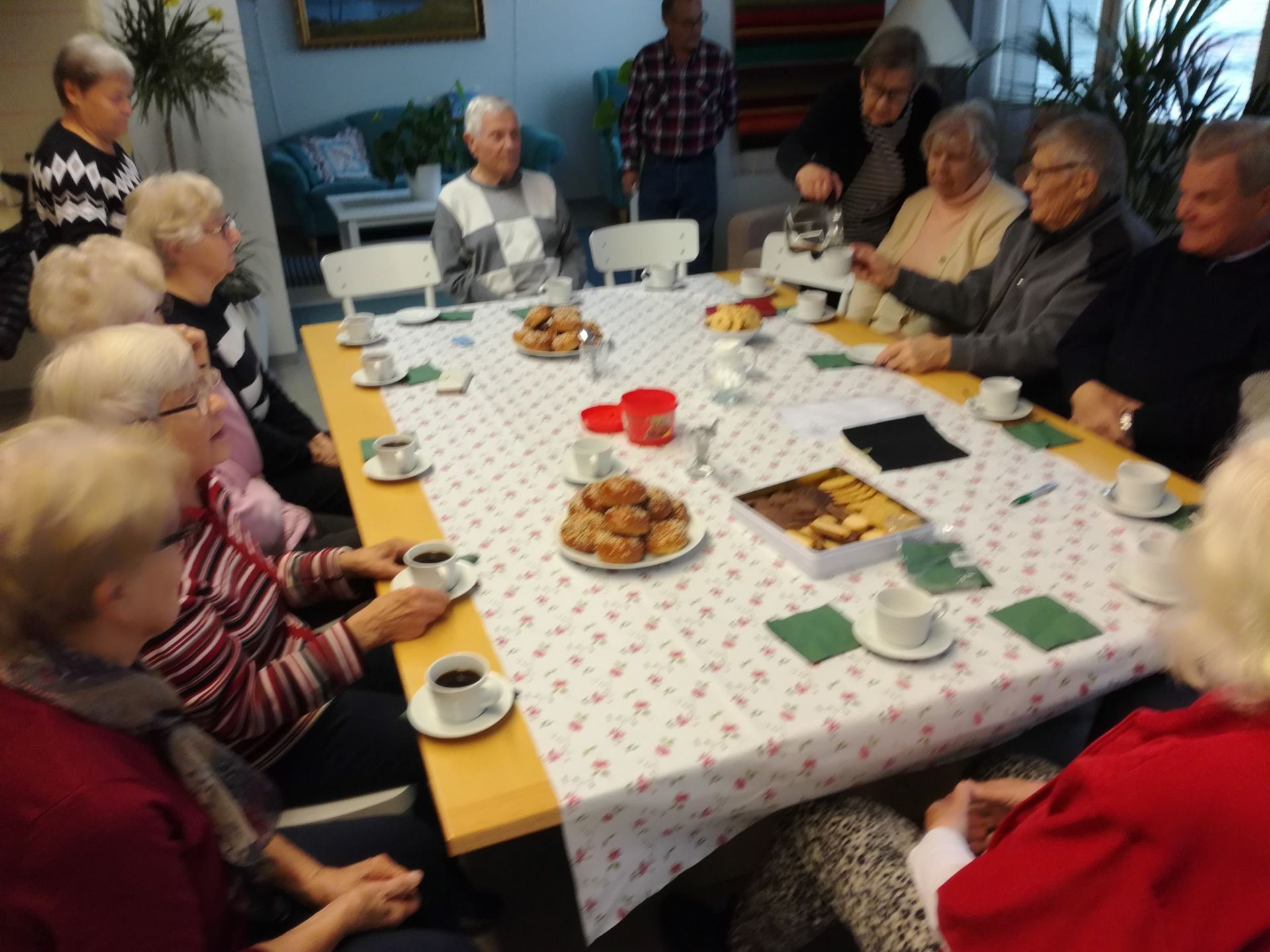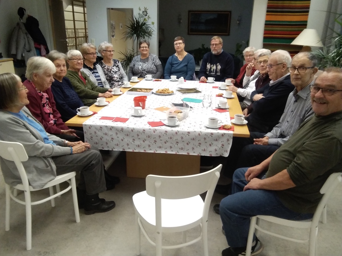 Höstens sista vänstuga med 18 glada vänner samlades i vardagsrummet Esplanad där Benita och Marita hade hämtat glögg, pepparkakor, jultårtor, choklad, karameller och gott kaffe. Benita hade bakat goda jultårtor. Vad pratades? Banker och hur blir det med räkningar i framtiden. Det blir bara svårare hela tiden. Bankerna försvinner längre bort, snart måste vi väl till Helsingfors. Sen var det julmat och skall det vara hemlagat eller färdigt köpta. Alla är goda. Bordet var långt så alla diskussioner hördes nog inte, men mycket prat i båda ändorna. Mona räckte ett paket åt Benita och Runar. Det var ett fint ljus med tomtar. Mona sade ett det är så roligt att komma till vänstugan och träffa alla, och så är där färdigt dukat kaffebord. Hon tackade Benita och så blev det ju kram och applåder. TACK Benita och Runar. Nästa träff är julfesten lördag 14.12. kl:14:00 med Lucia och julgubbe.