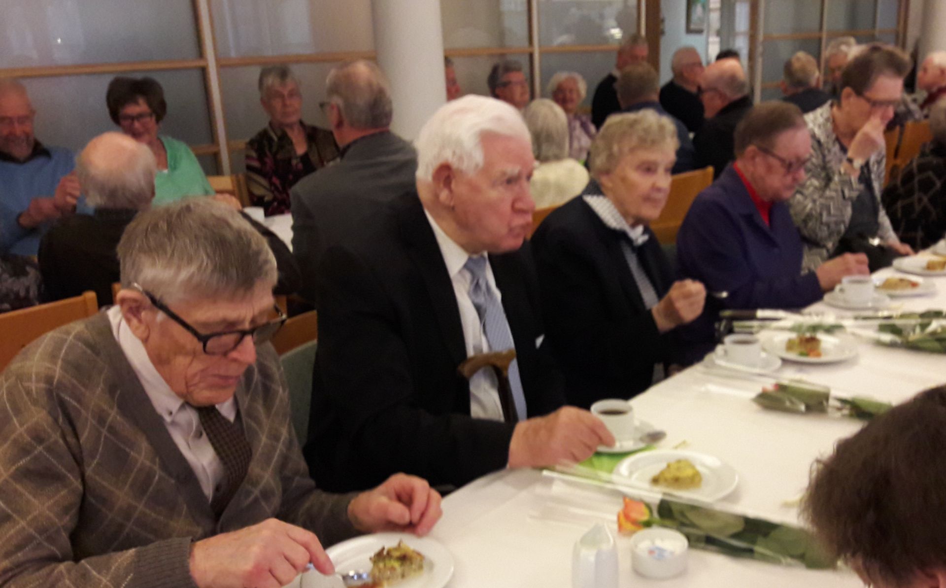 Varmt och skönt inne, lite snöflingor faller ute, nästan kallt, kunde man säga. Varmt kaffe eller te med skuribulla och småbröd. Lite godis från seniorkryssningen det njöt vännerna av i vänstugan. Förstås pratades om kryssningen, sen om olika namn, det är ju svårt att hitta på namn åt barn nu, för det skall vara internationellt. Fågelmatning kom fram, bra eller inte bra, kommer det möss och söka frön? Ekorrar i alla fall hos oss, dom gömmer solrosfrön, så får jag blommor till sommaren. Födelsedagar diskuterades, det är så många som fyllt jämna år. Grattis till alla. Det var rekordet idag 2 bord 22 personer. Duktigt.