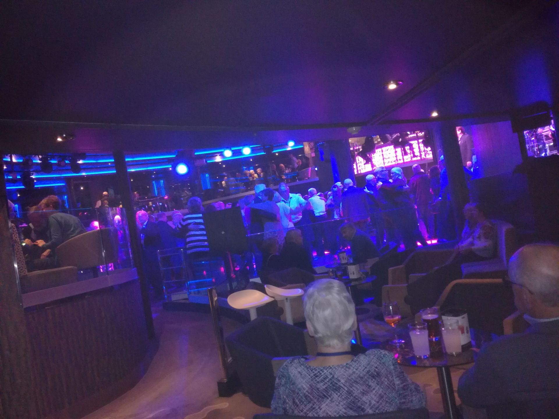 Allsång med Håkan Wikman, bekanta sånger för alla. Lite paus och mat före dansen. Och nog var dansgolvet fullpackat. Seniorerna kan och vill dansa, det ser man. Midnatts show började med ljuseffekter och dunkande bas. Där vid laget blev det tomma stolar i restaurangen. Följande dag var det mycket dagsprogram. Busstransport till centrum och Nationalmuset för dem som ville dit. Bingo, pysselhörna med julpyssel, IT verkstad för frågor om dator eller smart telefon, yoga och mycket annat. Privat shopping i taxfree, ja det var nog inte så bra idé, det blev faktist trångt när hela högen med seniorer kom på en gång. Danskurs i bugg och modevisning i restaurangen var omtyckta. Så dags för middag, och kvällsprogram som var nästan lika som kvällen före. Där hände ju hela tiden nåt i någon ända av båten, alla hinner man nog inte till. 41 seniorer från Lovisa, Pernå, Isnäs och Borgå var nöjda på hemvägen.Bilden från dansgolvet är lite mörk, men som ses fullpackat golv. Bra så. Inga-Lill
