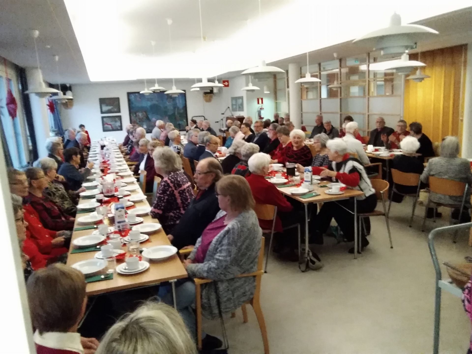 Nu är det Jul igen. Julfesten hölls på Servicehuset Esplanad.Ordförande Håkan Karlsson önskade alla välkommen. Söta Lucia med tärnor skred in, vackra med ljus och sång. Lucia med tärnor sjöng julsånger och läste julberättelse.Det är så vackert att se Luciaföljet. Endast snöstormen fattades, det hörde till på Luciadagen förr. Efter Lucia åt vi julgröt och drack kaffe med tårta. Sen klingade julsångerna. Julgubben kom och överraskade, alla pensionärer hade varit snälla och fick julklapp. Tack julgubben. Efter att önskat alla GOD JUL och GOTT NYTT ÅR blev det hemfärd. Vi träffas 8 januari 2020.