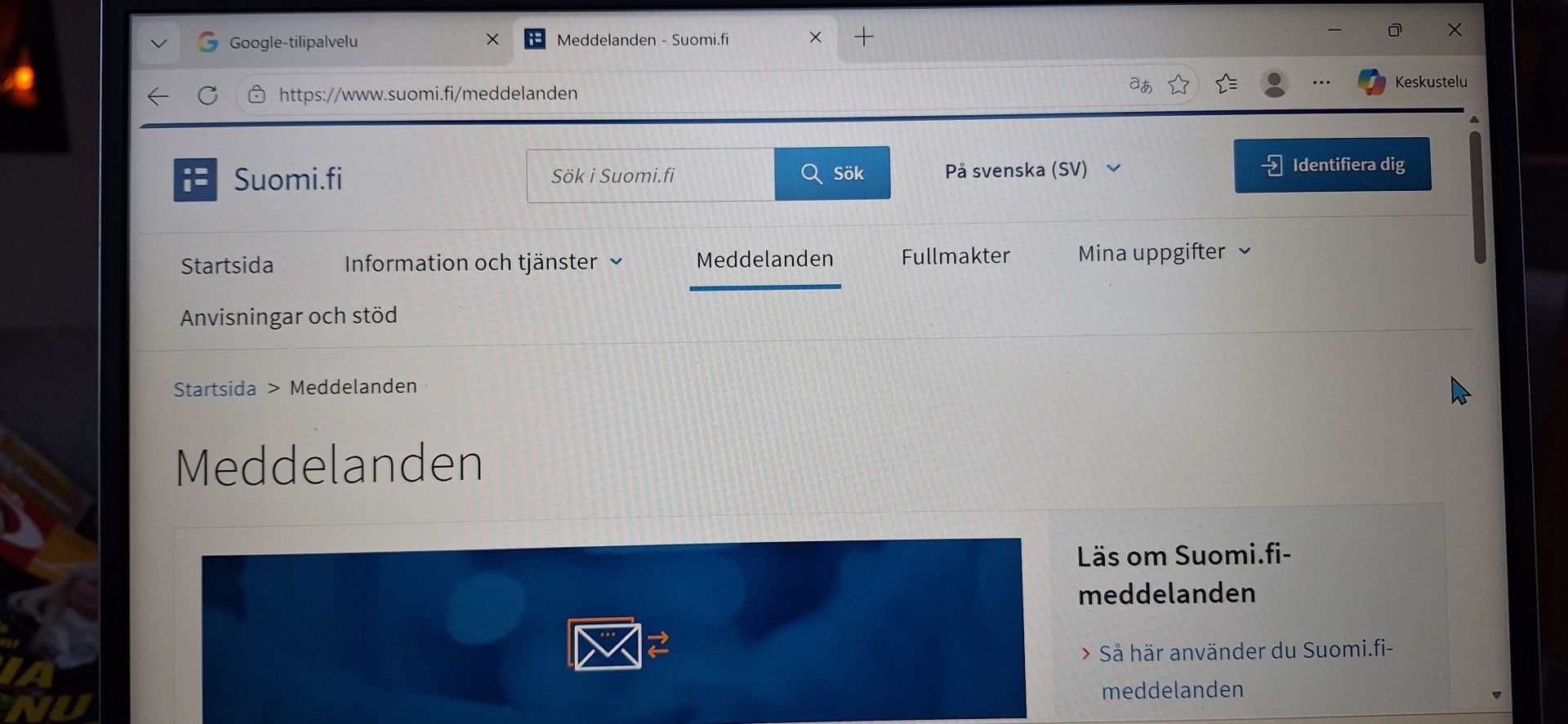 Skriv i sökfältet suomi.fi/meddelanden, klicka på knappen identifiera dig, välj hur du loggar in, med bank koder eller mobilcertifikat, följ instruktionerna.